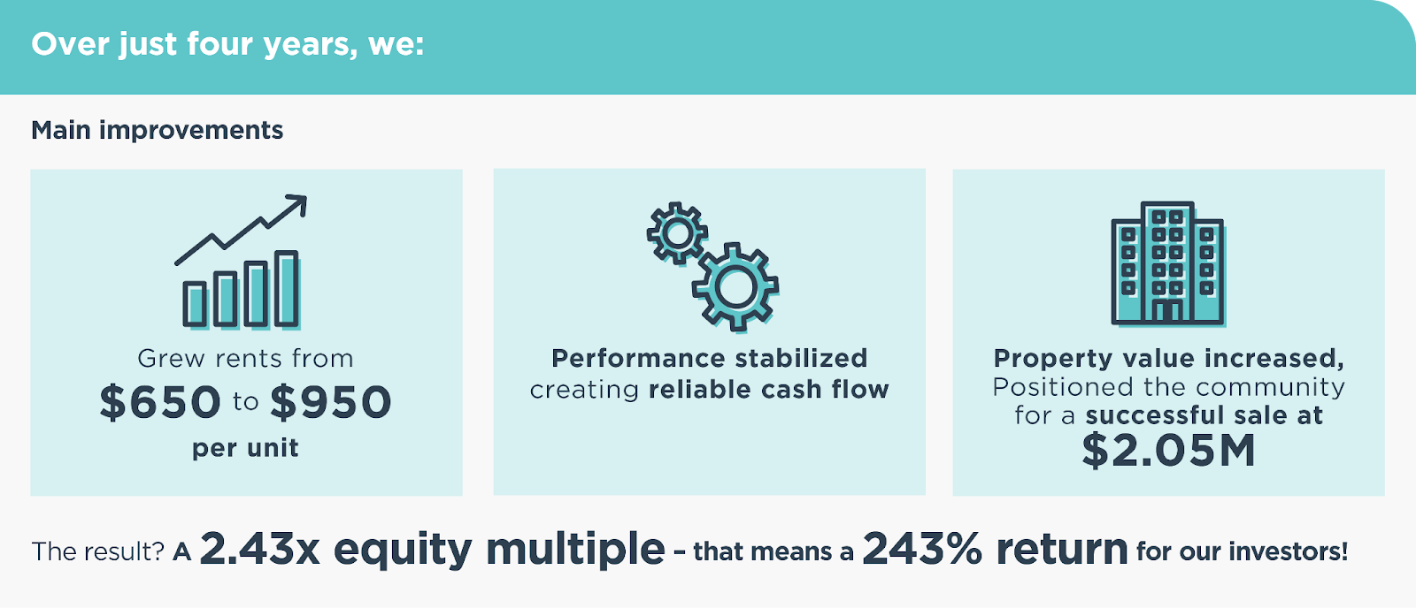 For our investors, this represented a 2.4x equity multiple and a 243% return. To put that in perspective, an initial investment of $293,512 grew to $712,915.