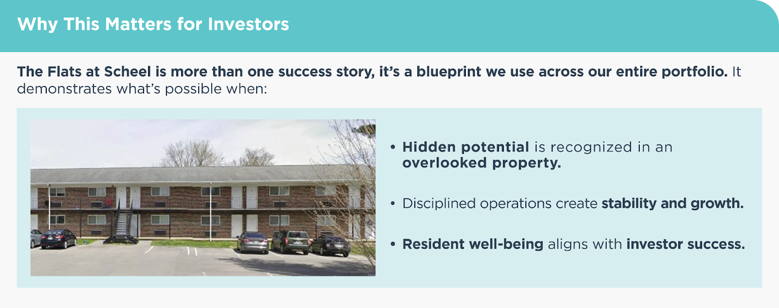 - The Flats at Scheel achieved a 243% return and 2.43x equity multiple through active management.