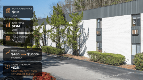 In 2021, a 128 unit apartment community was acquired through an off market opportunity tied to a complex family legal situation. The property was purchased for approximately 8 million, or about 60,000 per unit.